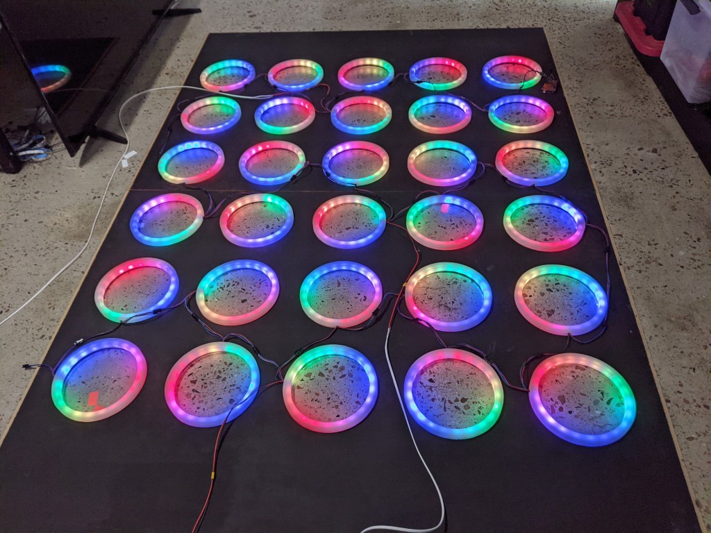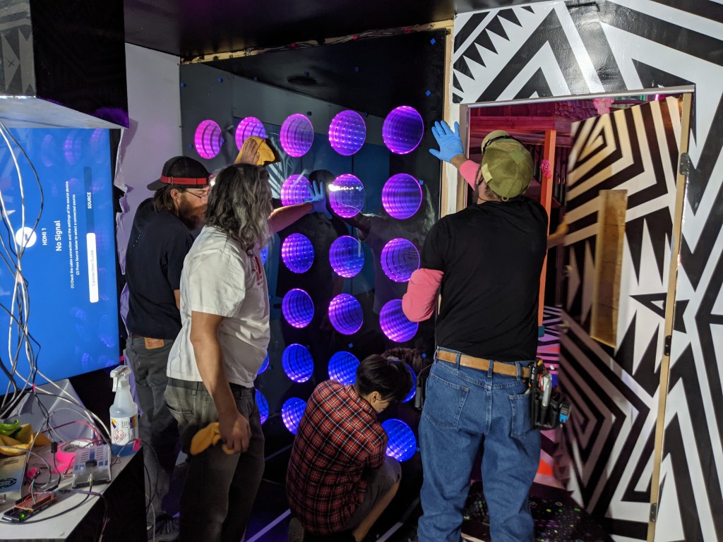 Created for the multimedia installation “Sirens: Secret Passkeys & Portals”, the Charger Wall symbolizes a technologically advanced power source within artist Virgil Ortiz’ fascinating sci-fi vision of Native American culture. The build took place in several steps over a period of many months – fabricating the rings, embedding the LED strips, programming lighting patterns and interactivity, and finally installing the entire piece within an infinity mirror. The final result is part of an ambitious artwork that combines sculpture, video art, sound design, and electronics with bold narrative ideas.