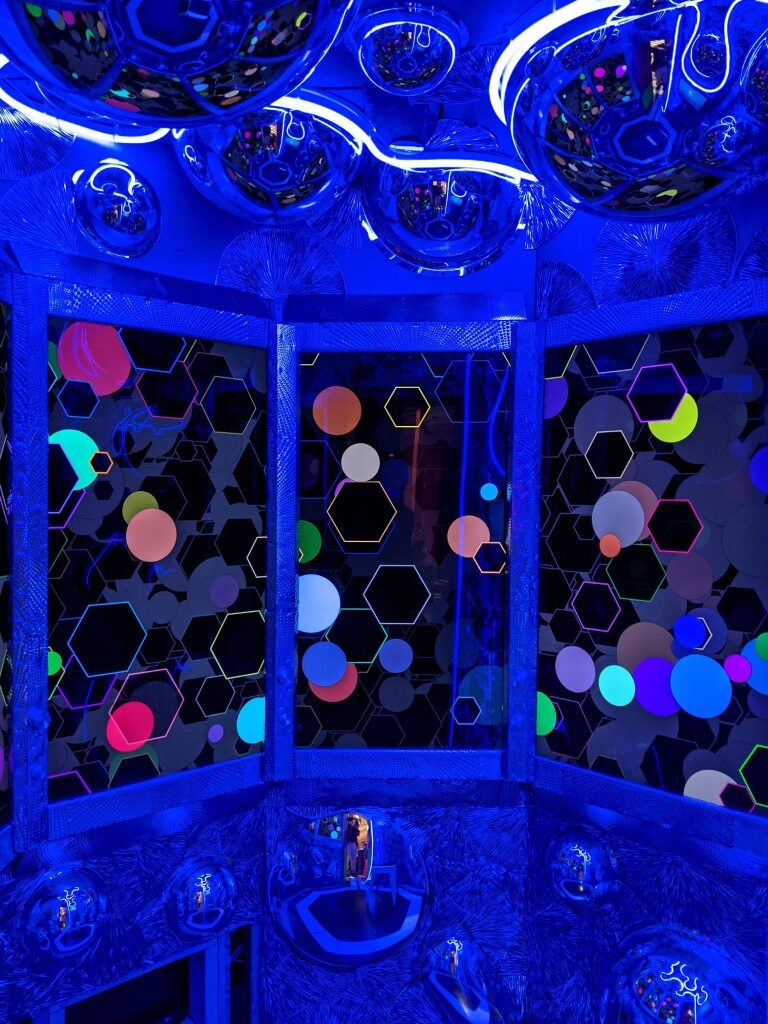 The Lighthouse is a sugar rush of sensory immersion. Upon stepping inside, you are surrounded by digital screens, blue LED neon tubing, and mirrored spheres. Embedded control knobs act as a psychedelic sketchpad, encouraging visitors to draw on the walls by directing a collection of colorful shapes. As the screens fill with color, funhouse reflections bounce around the room.